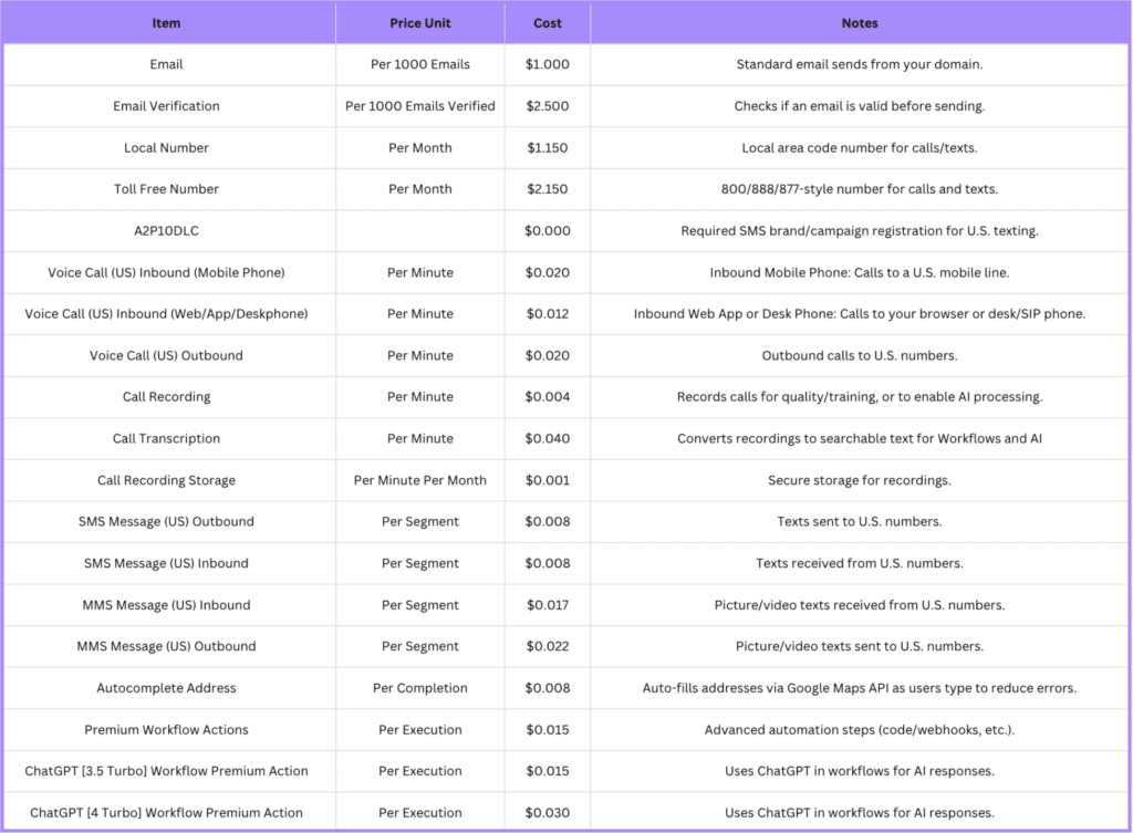 In addition to our straightforward monthly pricing plans, there are some additional fees you might encounter based on your usage. These fees come from our third-party providers for services such as SMS, MMS, voice calls, phone numbers, and AI-powered tools like OpenAI.